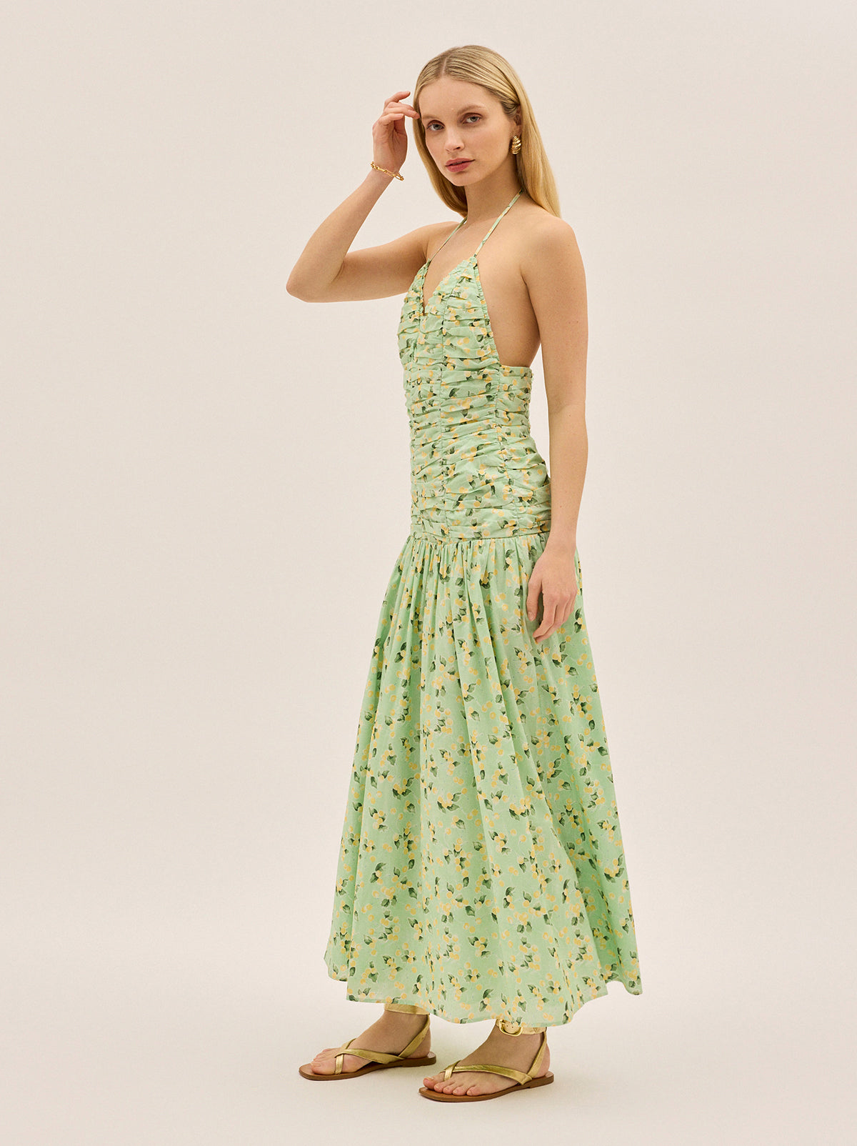 Designed to flatter from every angle. The Cynthia Dress is cut in our delicate green cherry print with a fitted bodice, ruched through the front for a sculpted shape. A soft frill trims the bust, while the halterneck ties behind the neck for an adjustable fit. The dropped waist flows into a gathered skirt for a relaxed, easy silhouette that moves beautifully.
