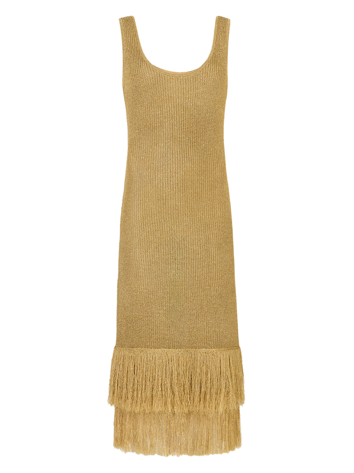Sandra Gold Lurex Knit Dress in a shimmery gold lurex knit offers a body-skimming silhouette that moves effortlessly with you. Designed with a flattering round neckline, sleeveless cut and double fringe detail at the hem, it radiates a 1920s-inspired charm, perfect for party season or any occasion that calls for a statement piece.