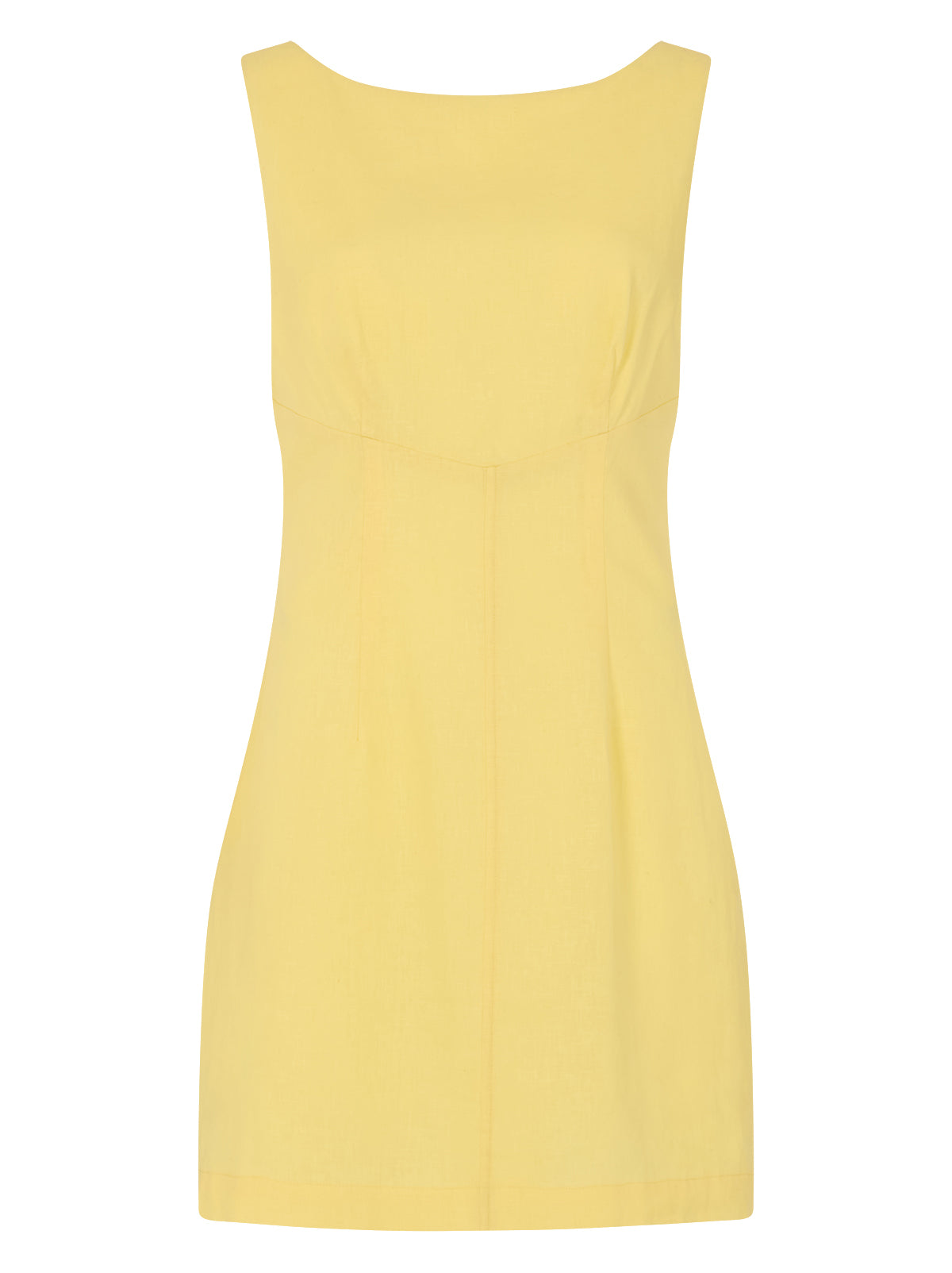 Meet Elodie, your new go-to ‘90s-inspired shift dress. Cut in a flattering, body-skimming silhouette, this tailored mini is crafted from breathable cotton, linen blend fabrication in soft pastel yellow that works seamlessly from city days to weekend getaways. The elegant boat neckline meets a subtly sultry V-shaped back, striking the perfect balance between polish and ease.