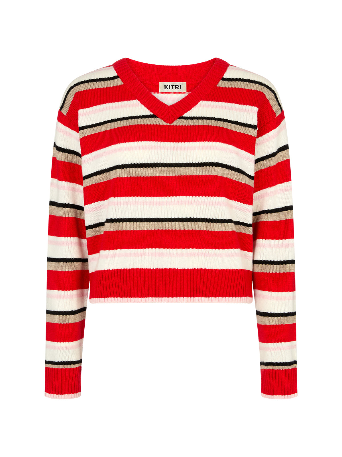 Knitted from a lightweight wool/cashmere blend, this jumper offers a soft, breathable feel that works year-round. The bold red base is offset by crisp stripes for a sporty-chic finish, and the flattering V-neckline makes it ideal for wearing solo or over your favourite t-shirt.