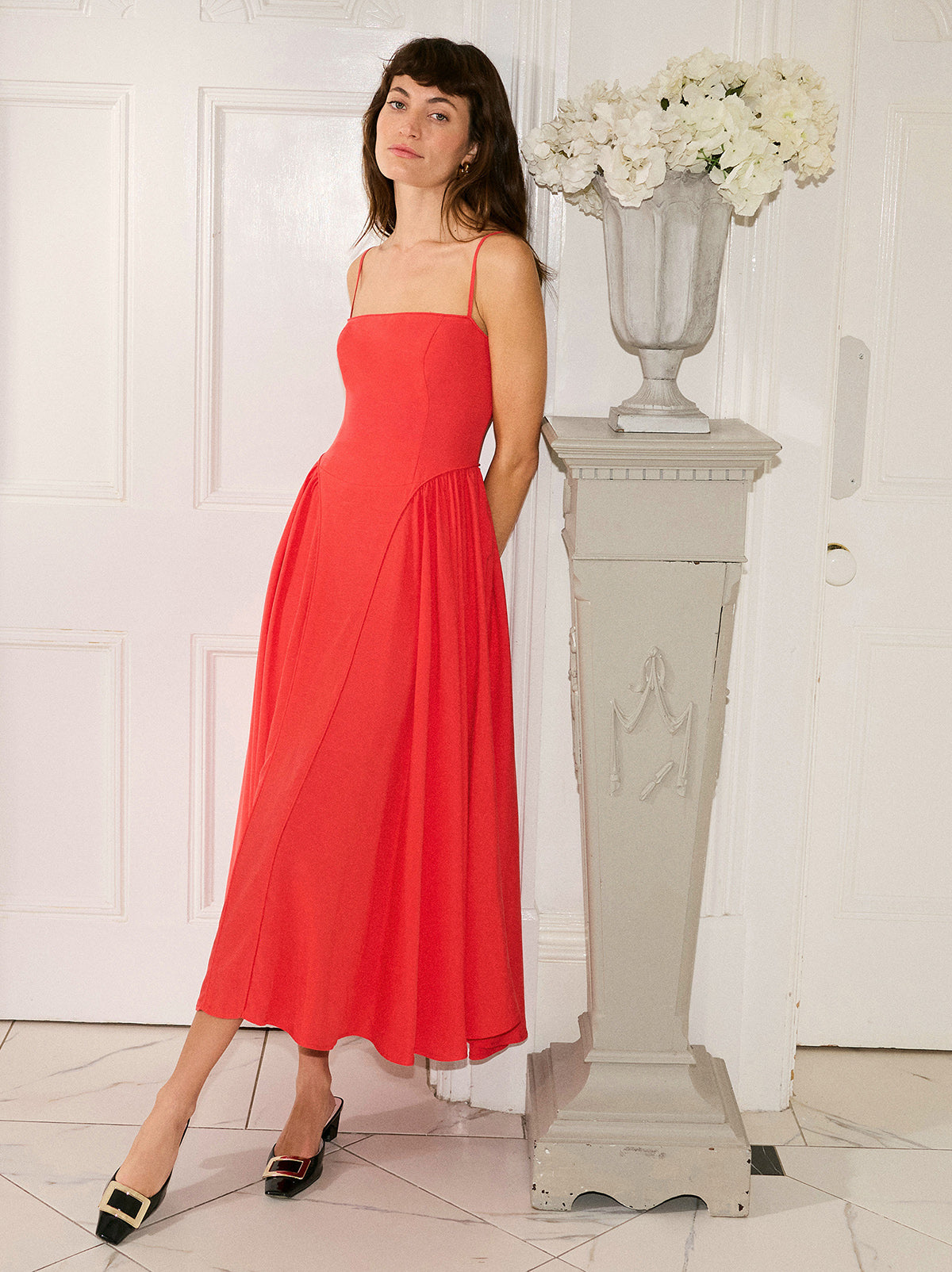 Alberta is an effortlessly elegant maxi dress designed to turn heads. Crafted from a breathable Tencel/Linen blend for a soft, fluid drape, this dress blends structure with movement. The fitted bodice creates a flattering silhouette, while self-fabric piping at the neckline and panelled seams at the skirt add subtle yet refined detail. A full, voluminous skirt brings drama and romance, and the shirred back ensures all-day comfort without compromising on style.