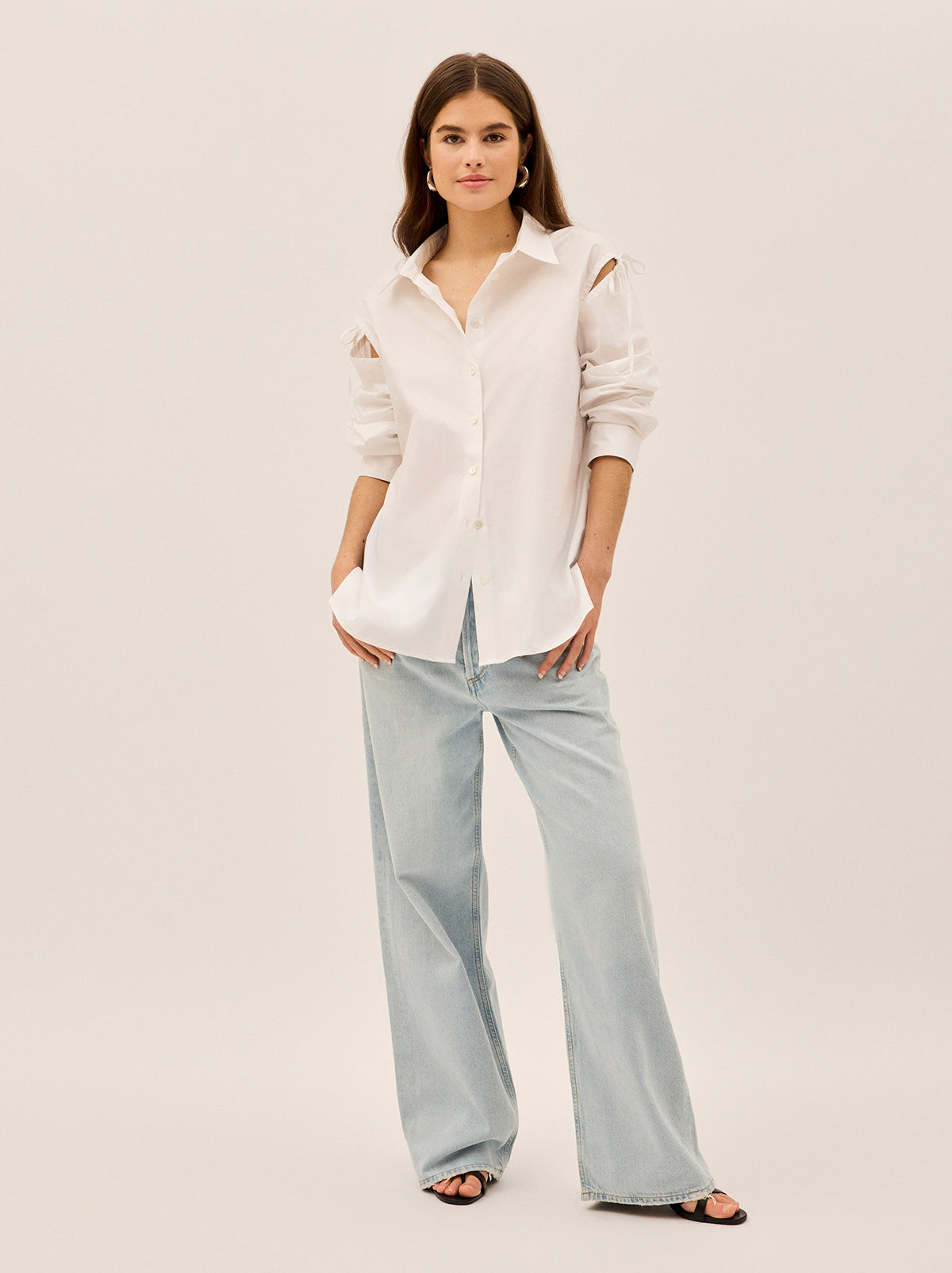 Meet Alix, your new go-to statement shirt with an effortlessly cool edge. Crafted from crisp cotton poplin, this oversized shirt redefines modern dressing with unique tie details at the shoulders, creating a subtle yet striking design. The boxy cut offers a relaxed, fashion-forward silhouette, while classic collars and mother-of-pearl buttons keep things timeless. With sleeves that are cleverly attached only at the shoulder ties, Alix is all about structured ease and contemporary charm.