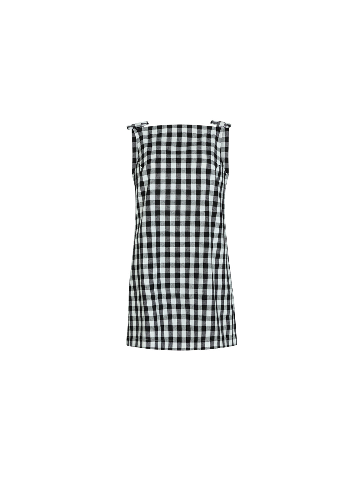 Easy, charming, and ready for wherever the day takes you. The Angelica Mini Dress is cut from a breathable black-and-white gingham linen blend in a classic A-line shift silhouette. It features a high, straight neckline and sweet bow details at the shoulders for a playful finish.