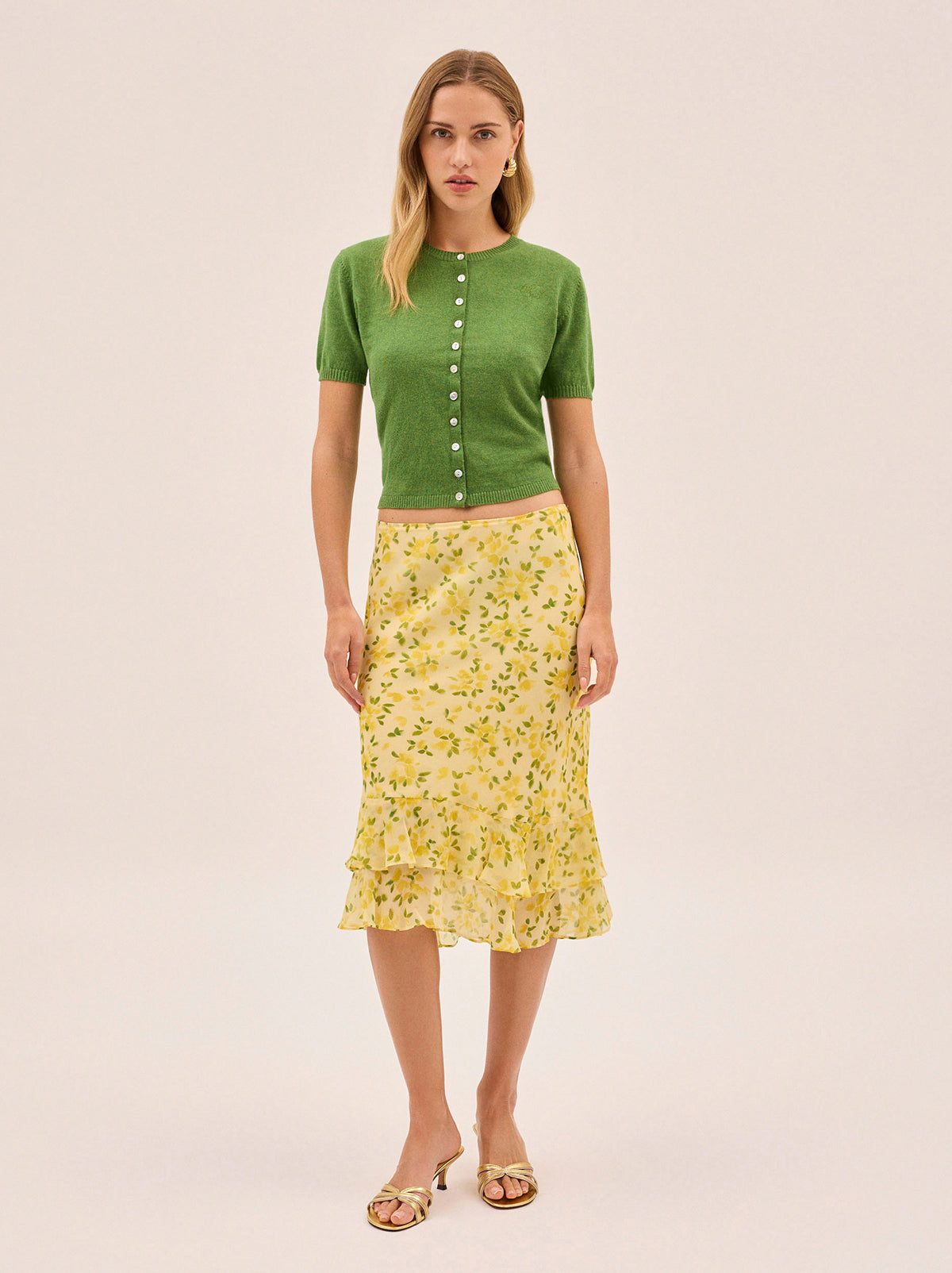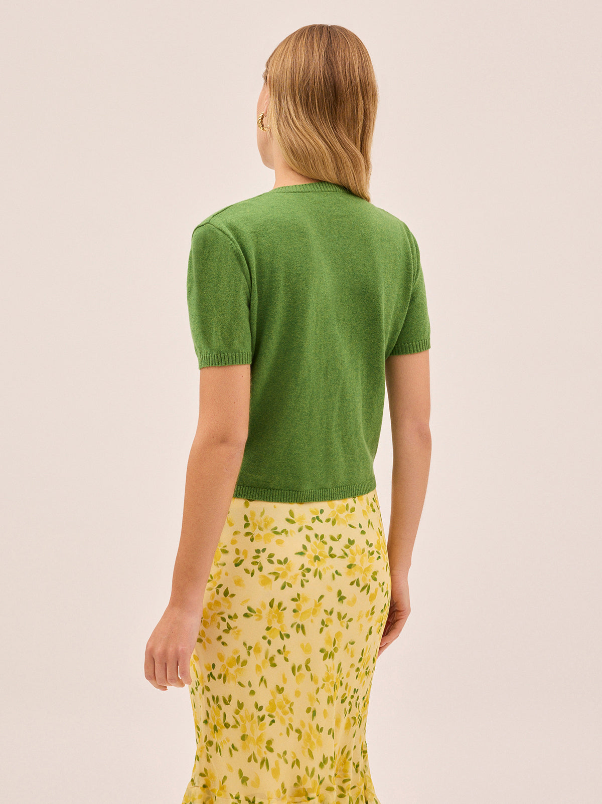 Blair is a 90s-inspired short-sleeve cardigan with a clean, modern feel. Crafted from a soft cotton and cashmere blend, it features small mother-of-pearl buttons, tonal K embroidery and a slim, flattering fit. The basil green shade adds a fresh pop of colour to everyday outfits while keeping the look understated and elegant.