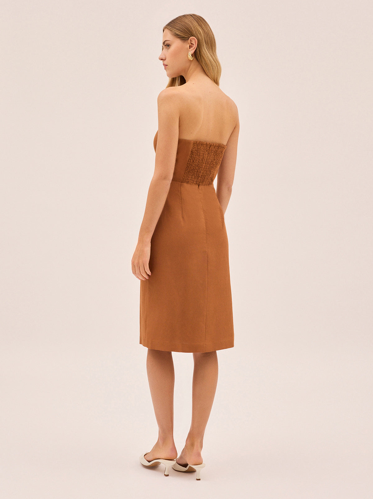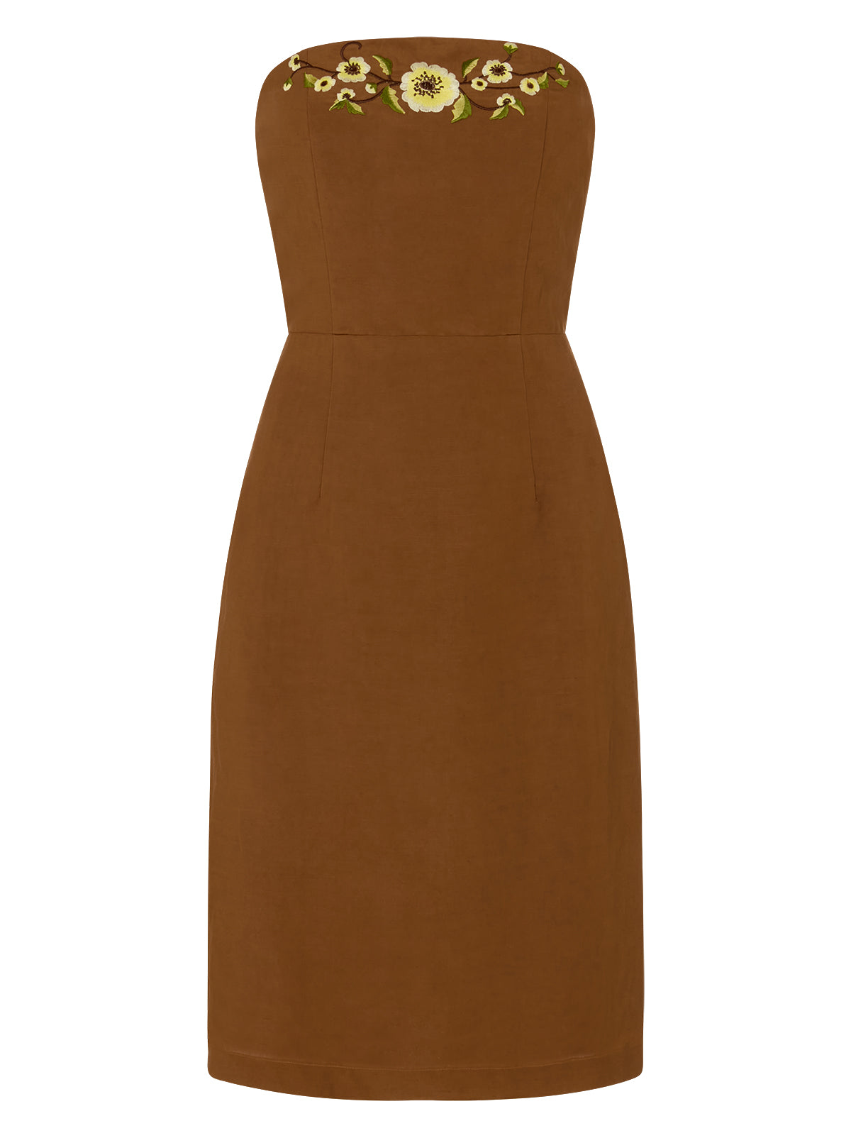 Cara is a 90s-inspired strapless dress with a clean, modern feel. Made from a soft Tencel and linen blend, it is fitted throughout and falls to a below-the-knee length for a sleek silhouette. The back features elasticated shirring for comfort and ease, while a side split adds gentle movement. Finished with delicate floral embroidery, Cara is an effortless choice for warm days and relaxed evenings.