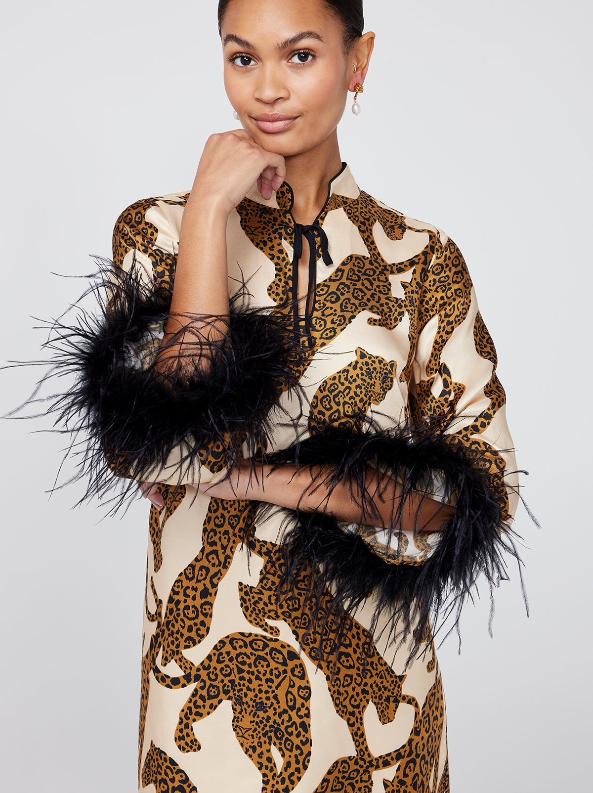 More is more, and Carlotta is the most. This mini dress is the ultimate retro party piece, adorned in a bold, vintage-inspired Leopards print. The Cheongsam-inspired collar adds a touch of Far Eastern sophistication, while the feathered cuffs elevate the drama and fun of this dress. Faux ties complete the look, and the relaxed fit keeps it effortlessly cool. Carlotta is made for glamorous nights and is perfect for when you’ve got fancy plans – or when you’re planning to ditch them for a better party.