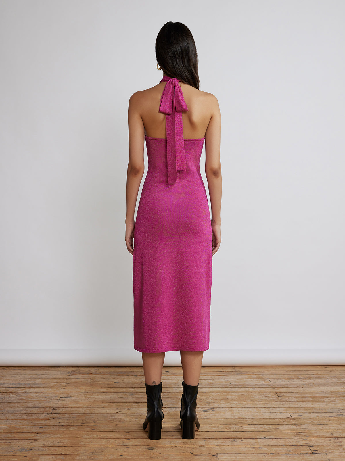 Too good for backstage. Crafted from sparkling lurex in the perfect hot pink shade, Constance is the perfect addition to your party wardrobe. Her adjustable halterneck and one leg split add a little extra va-va-voom. Looks great under a glitterball.