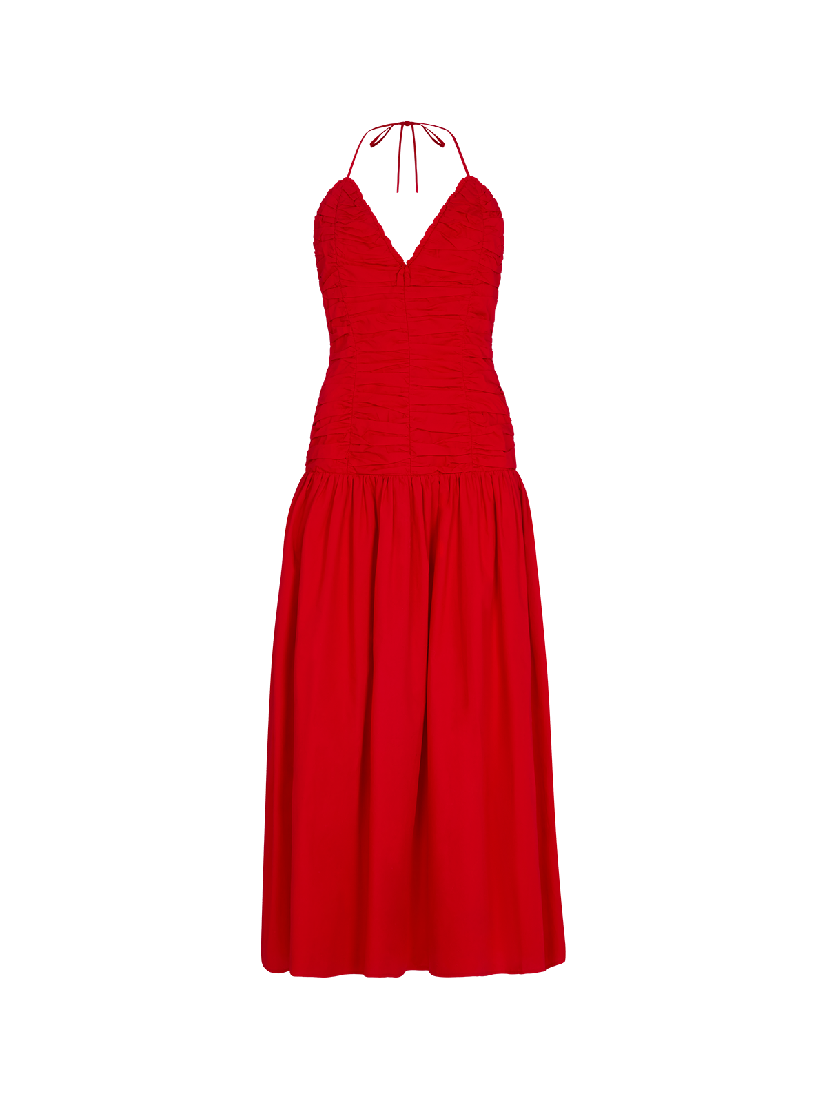 Cynthia brings the drama in bold, cherry red. Crafted from crisp cotton, this standout style features a ruched, figure-framing bodice with a soft frill at the bust and a flattering dropped waist. The halterneck adds just the right amount of skin, while the full skirt brings the volume. It’s the kind of red that turns heads & made for golden hour and dancing until late.