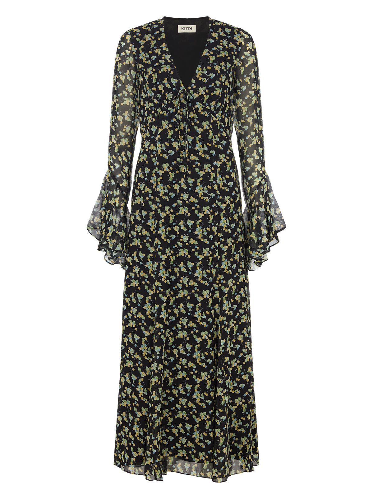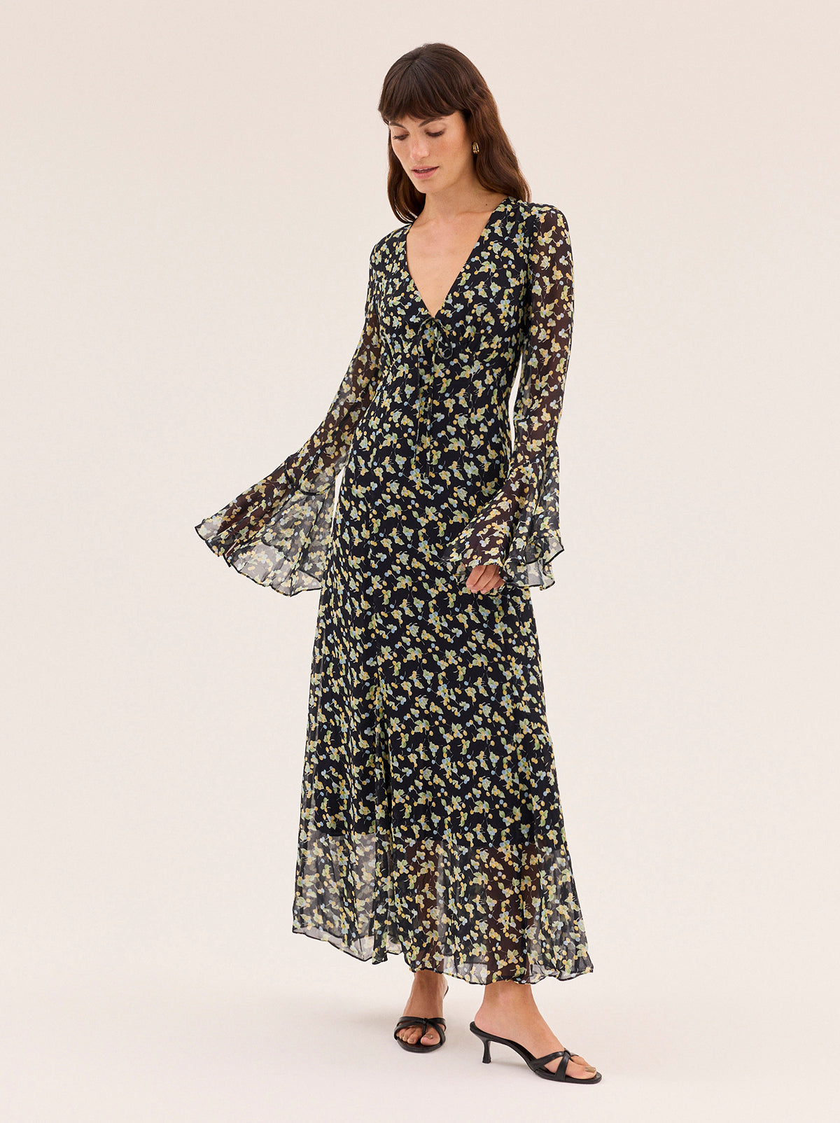 A flattering V-neckline flows into an empire line bodice, with a delicate tie bow at the neck for an elegant, feminine touch. The bias-cut silhouette skims the body, while godet detailing on the full skirt adds volume and swish with every step. Boho-fluted sleeves lend a soft, romantic feel, enhancing the dress’s vintage charm.