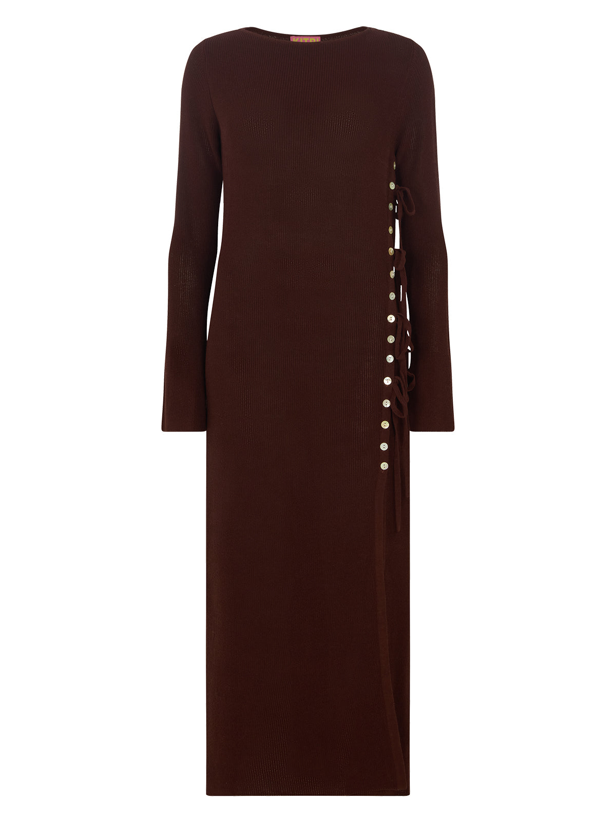 Daria Chocolate Knit Maxi Dress is crafted from a soft yet structured cotton-nylon knit in a rich autumnal hue. Designed with a flattering round neckline and a body-skimming silhouette, it features an asymmetric button closure along the side with adjustable tie details that add both texture and versatility. A daring thigh-high split balances the elegance with boldness, making it a piece that transitions seamlessly from day to night.