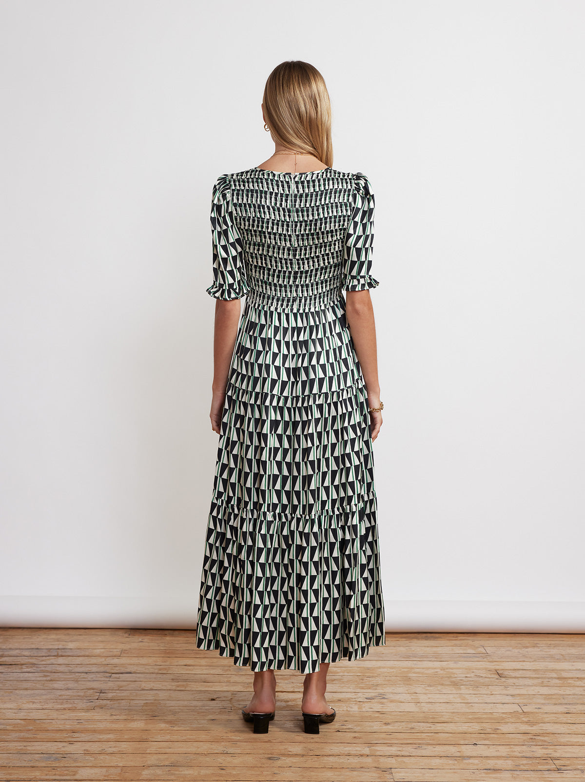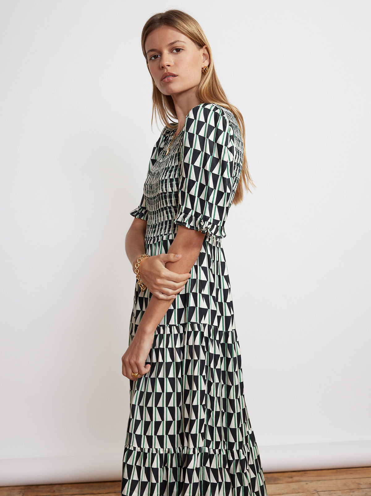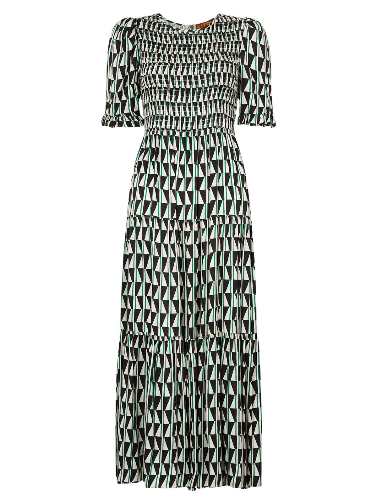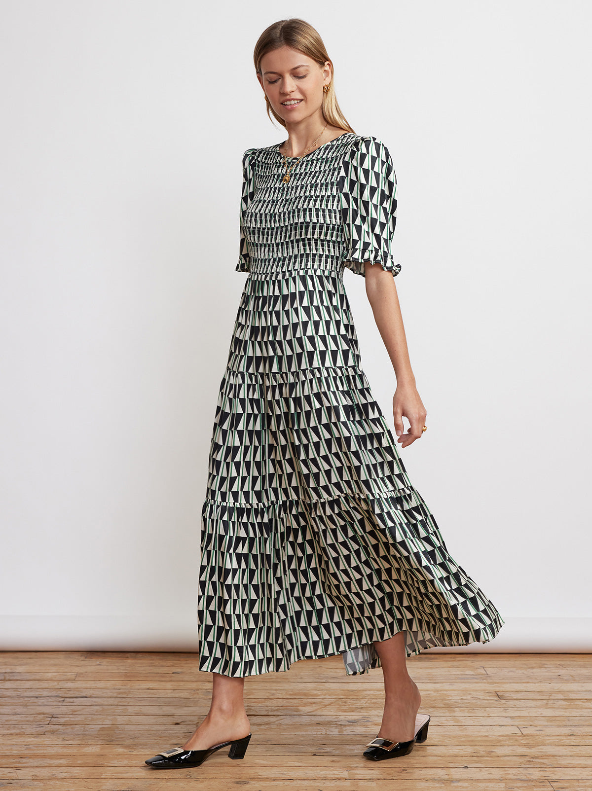 Gracie Shirred Green Tile Print Dress
