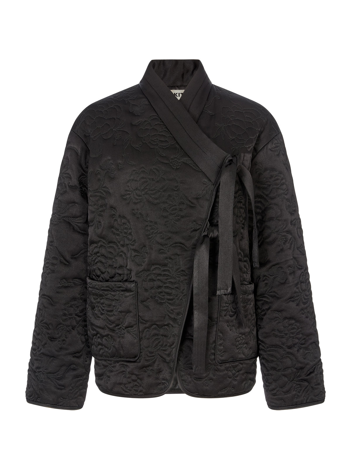 Lightweight, versatile, and artfully detailed - the Hani jacket is designed to be worn year-round. Cut from lustrous black viscose satin, it’s lightly quilted with an intricate floral pattern inspired by traditional Korean paintings. The silhouette nods to Hanbok design with its cross-over ties and subtle stitch detailing, creating a piece that feels both timeless and contemporary. Wear it as an elevated everyday layer or draped over evening looks for a polished finish.