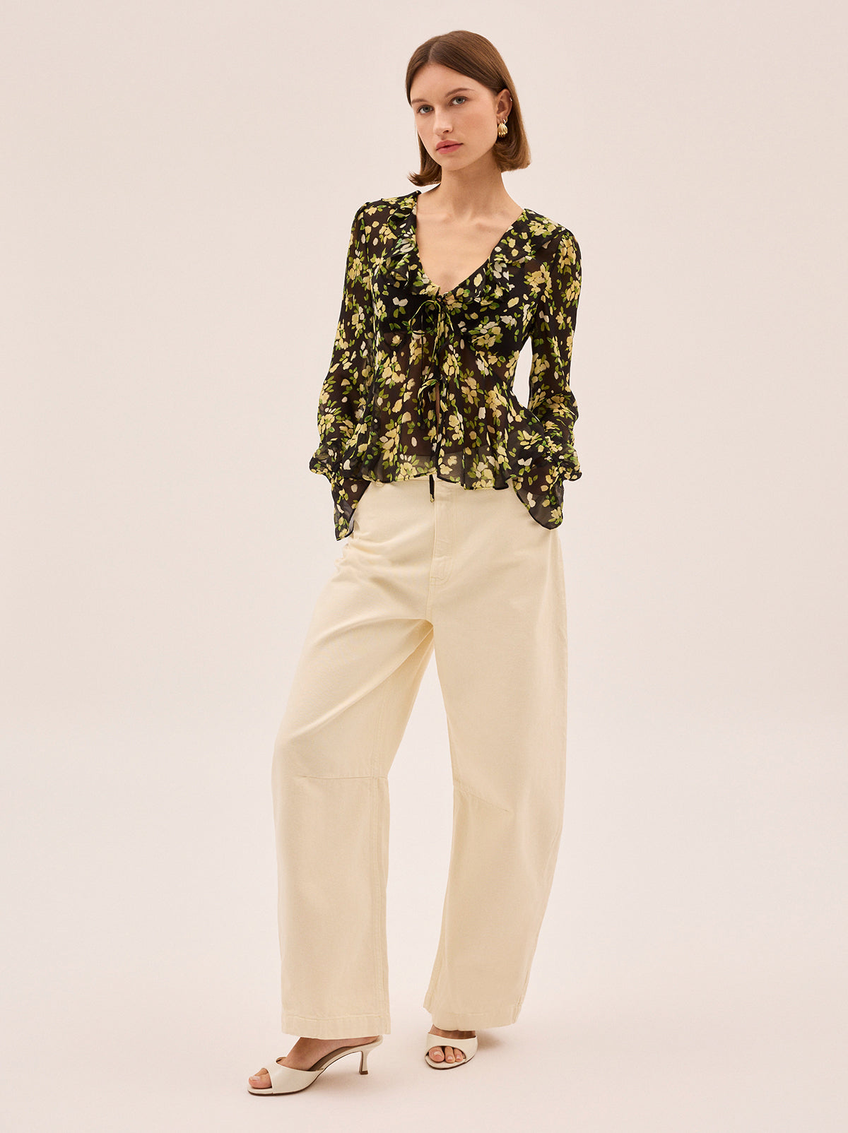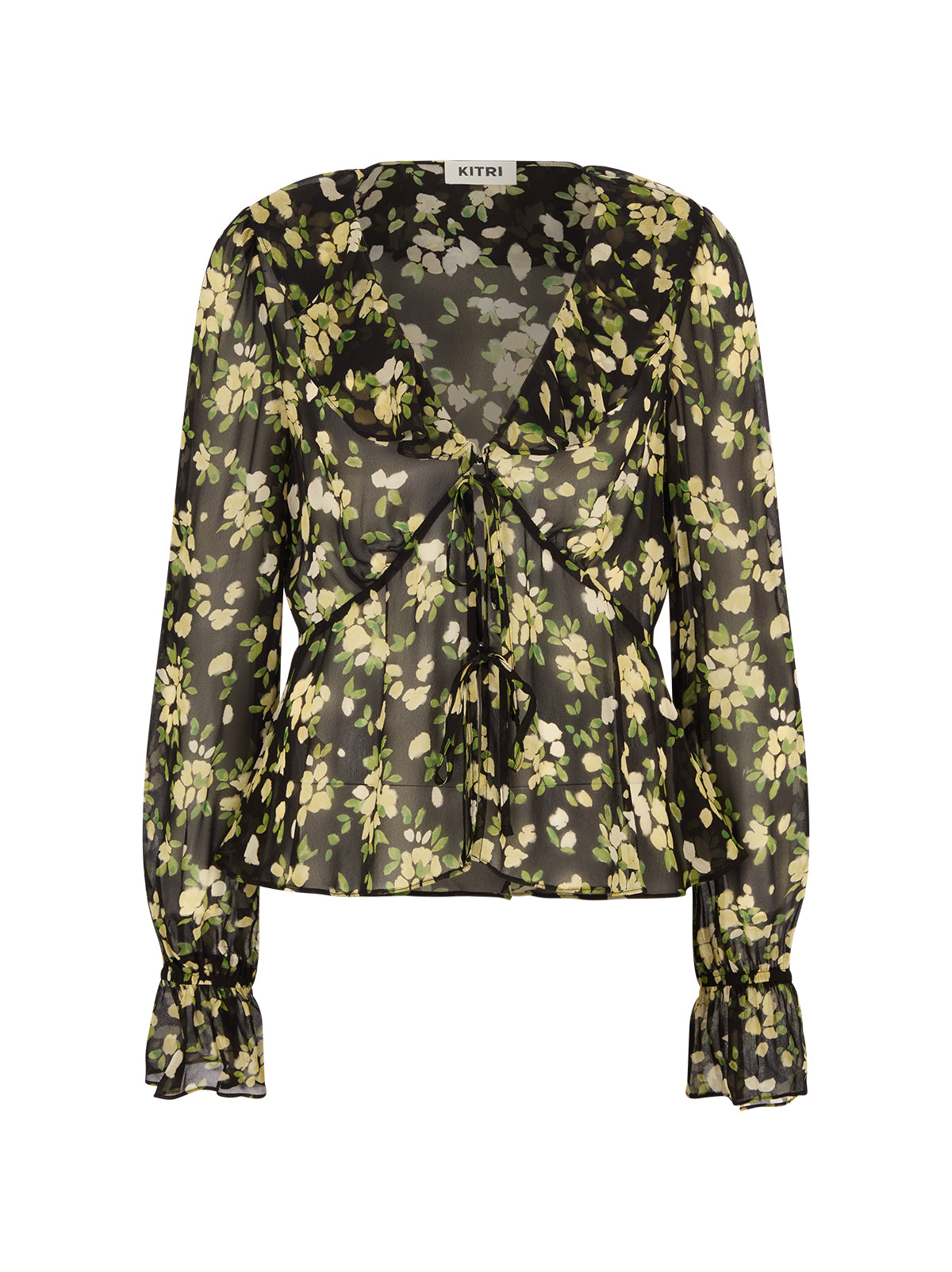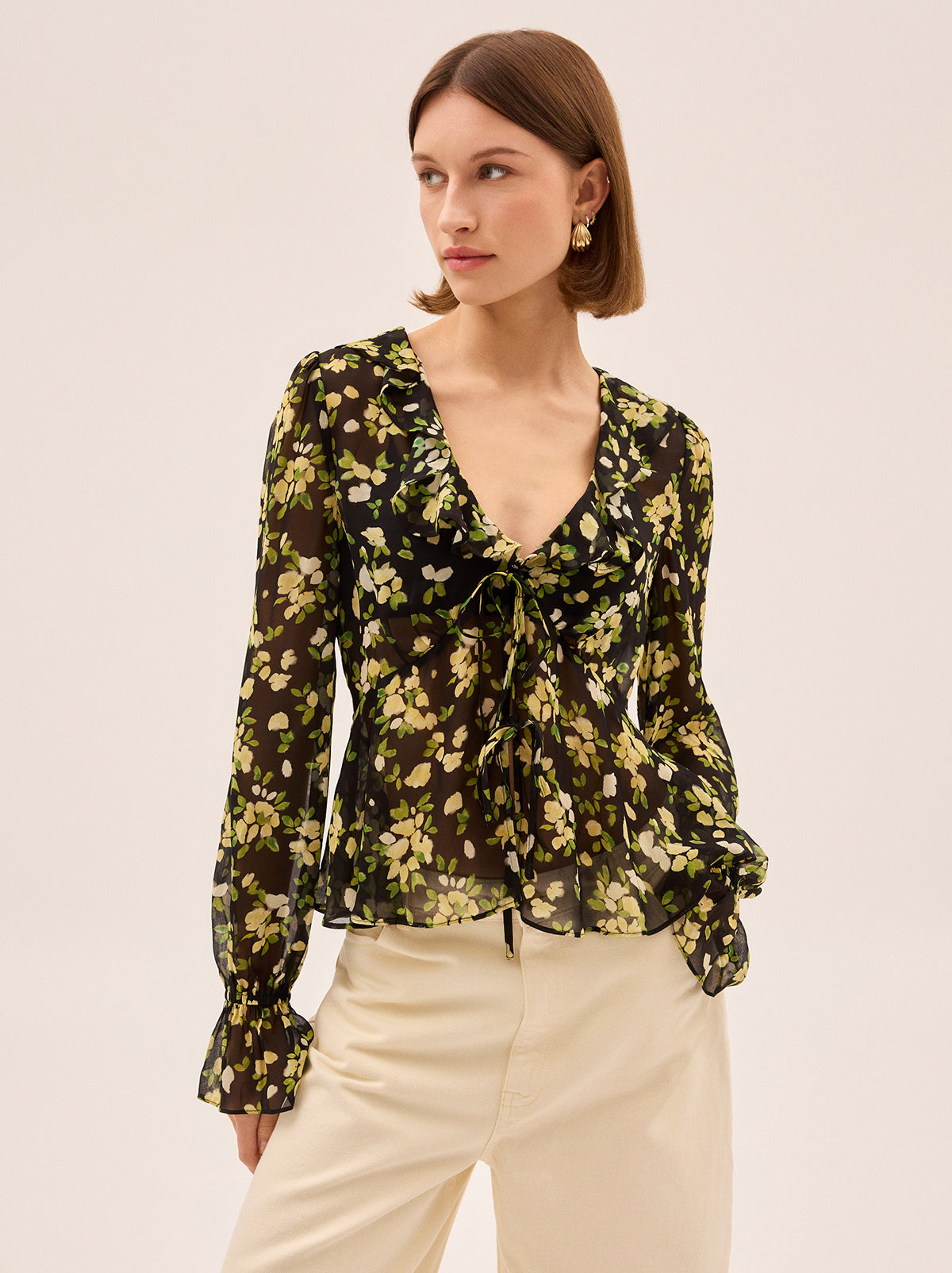 Meet Ione, a beautifully floaty blouse designed to bring soft romance to your everyday wardrobe. Crafted from airy, semi-sheer viscose georgette fabrication, it features a flattering V-neckline, delicate ruffle detailing, and a feminine tie-front that adds subtle shape. The black petal print scattered in fresh green and cream tones gives this piece a modern, painterly feel.