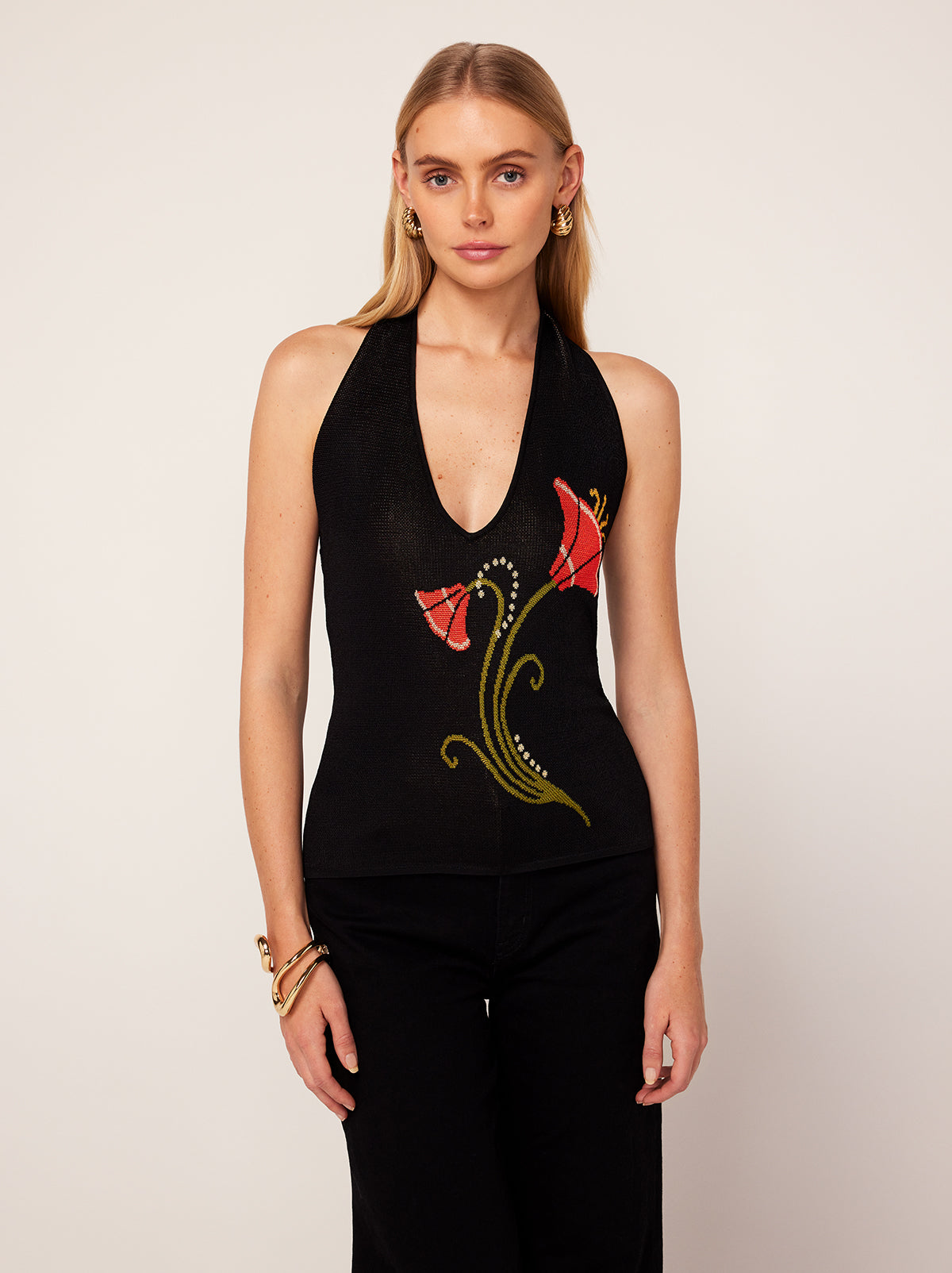 That nice top you've been looking for. She's a halter-neck knitted top made for something fancy. Flattering and figure-hugging, she's a jacquard knit with a sleek, compact finish. She'll look great with denim and heels for sizzling evenings by the sand.