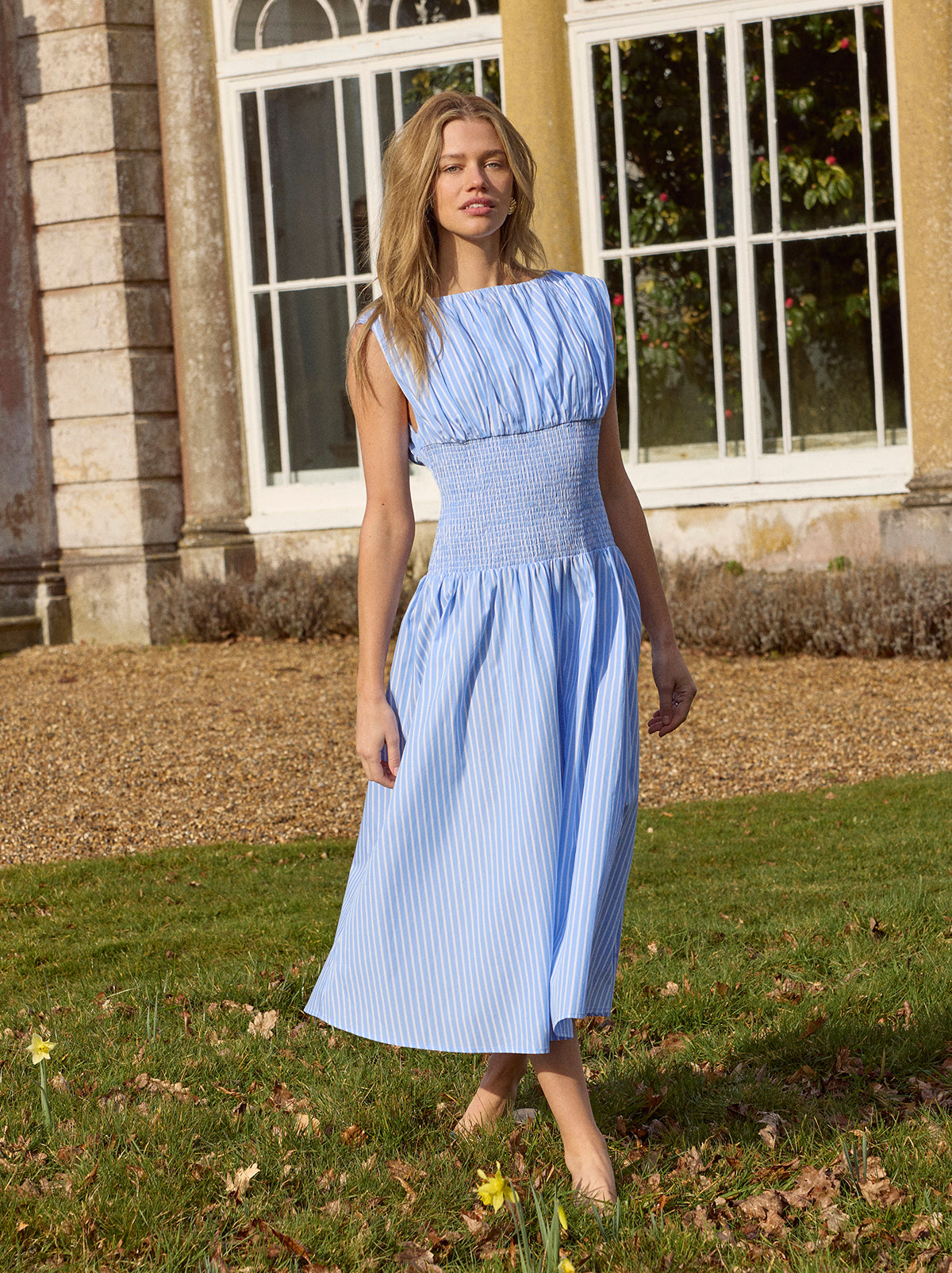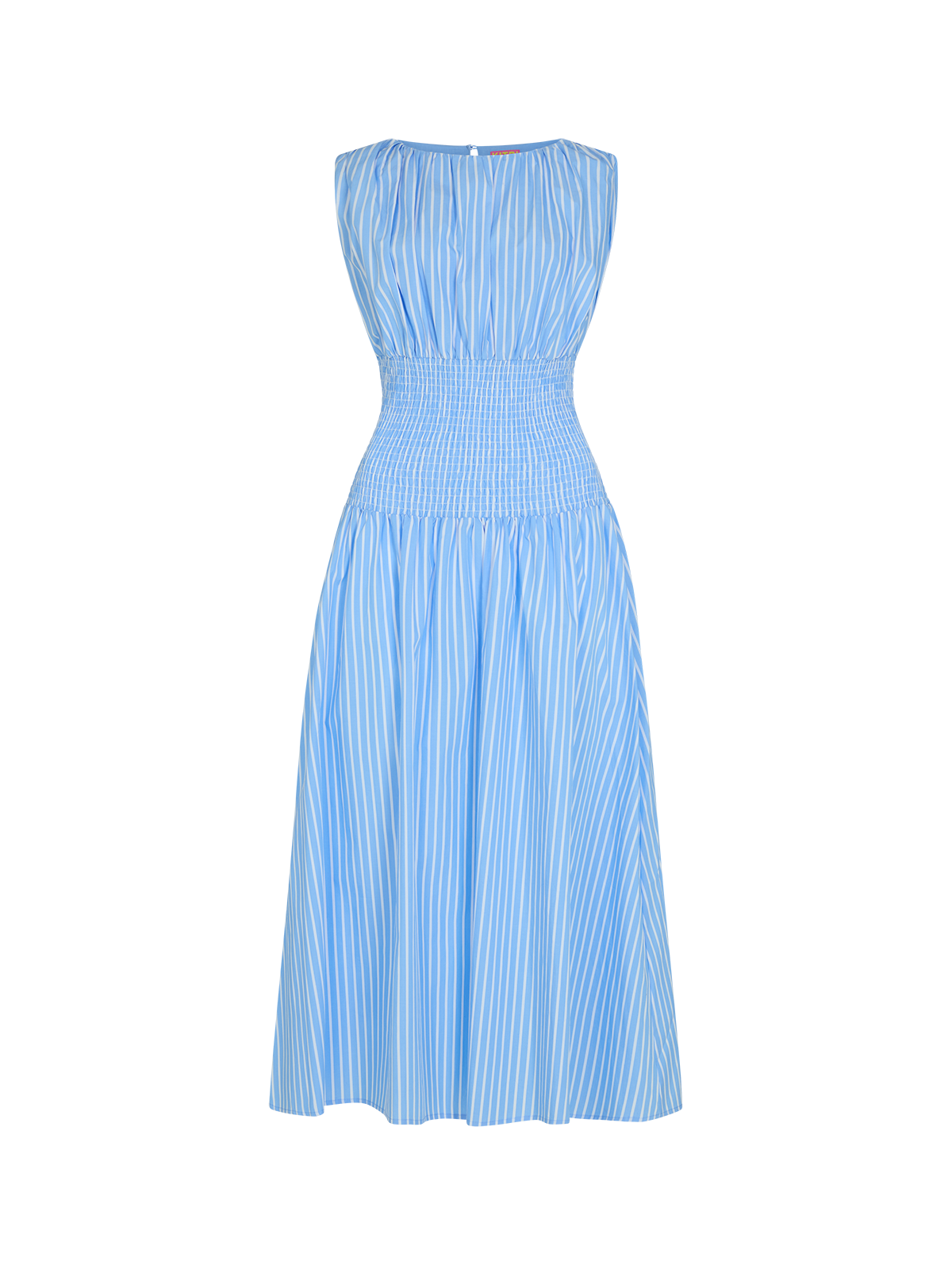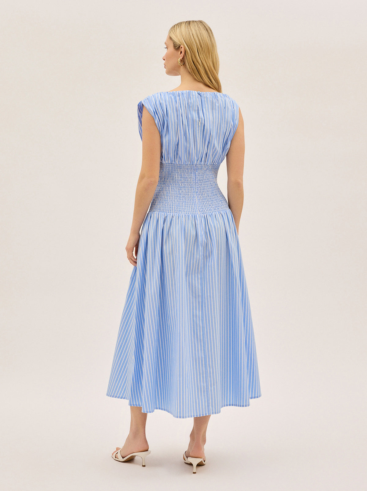 Crisp cotton, flattering shape, effortless charm. The Julia Dress is cut in a soft blue stripe with a wide boat neckline, gently gathered bodice and a shirred dropped waist that defines the silhouette. The full, A-line skirt falls to a midi length for an easy, throw-on-and-go feel without compromising on polish.