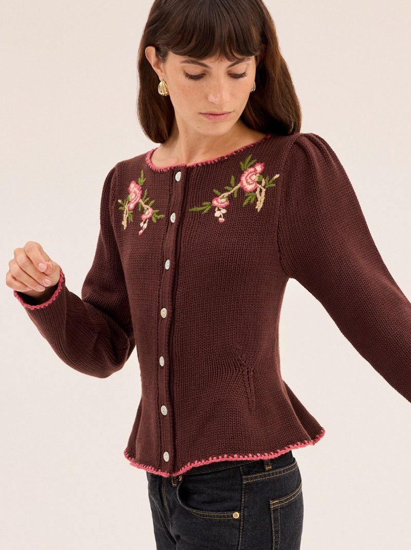 A true heirloom-in-the-making, this vintage-inspired knit cardigan blends craftsmanship with everyday wearability. Spun from a mid-weight cotton-wool blend, it’s detailed with intricate, hand-embroidered florals in rich autumnal tones. The flattering peplum silhouette and slash neckline are finished with contrast blanket-stitch edging for a refined touch. Perfect for pairing with tailored trousers or denim, it’s a timeless statement piece designed to be treasured season after season.