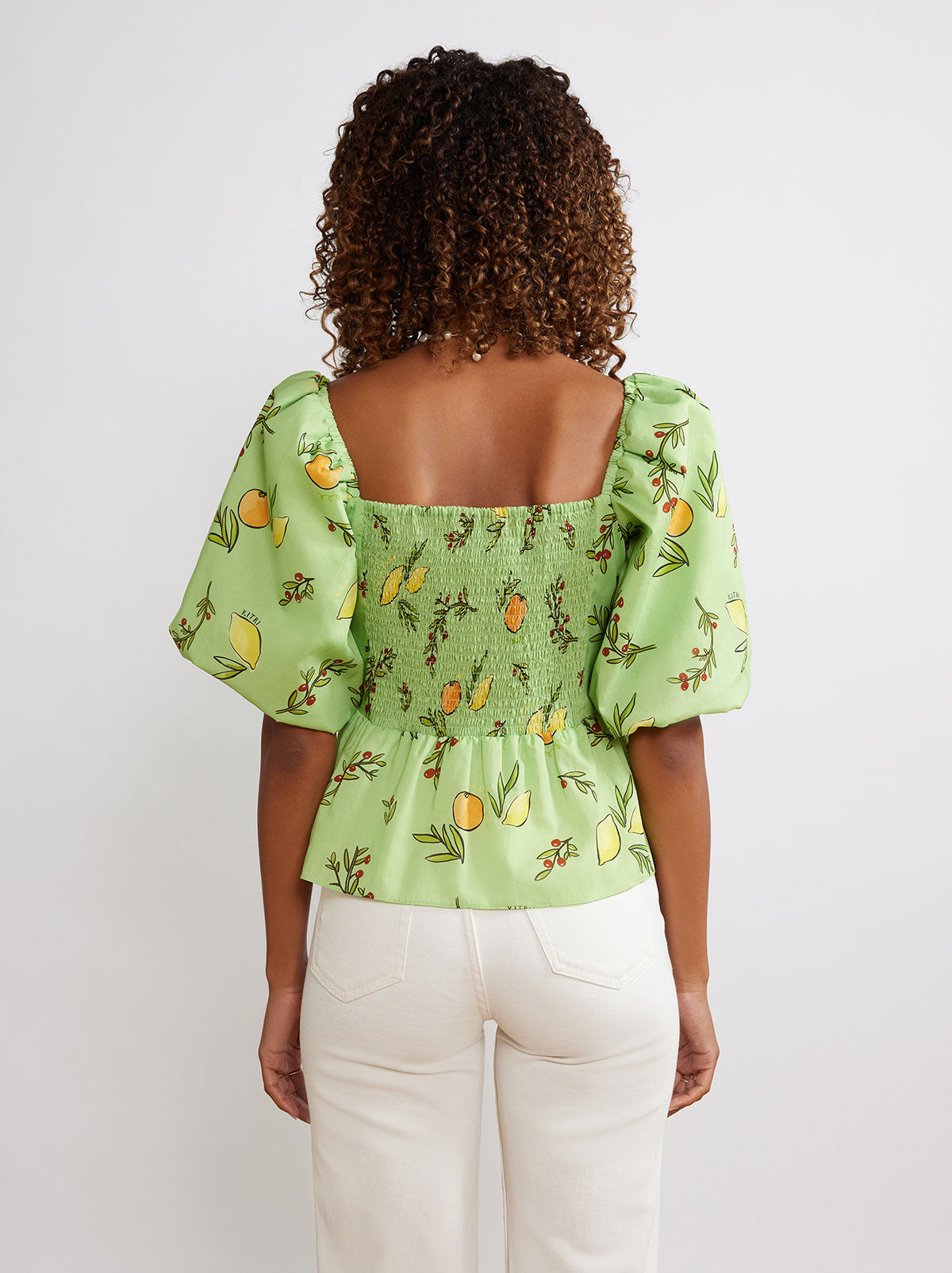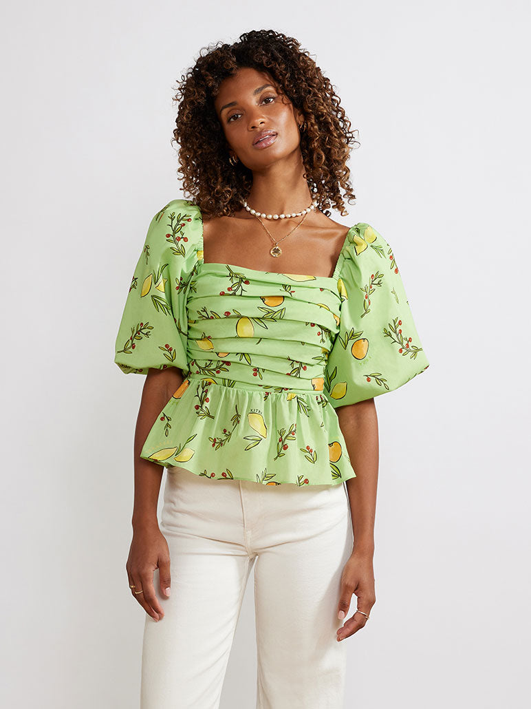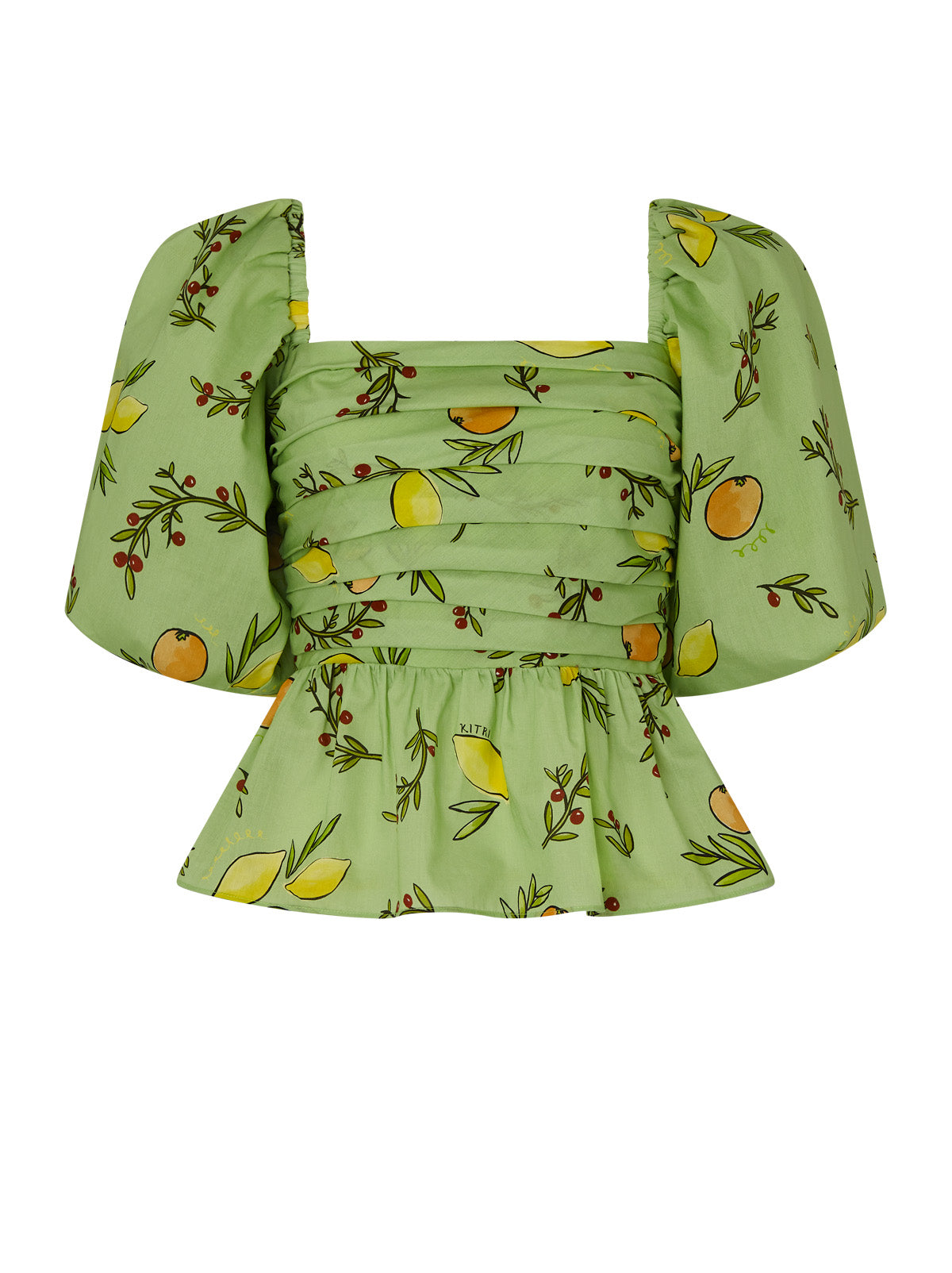 Meet me in the lemon grove. Cut from a pastel green cotton blend, Lois features hand-painted fruit motifs to keep things fresh. Balance out her peplum silhouette and puffed sleeves with high-waisted denim or a tailored trouser.