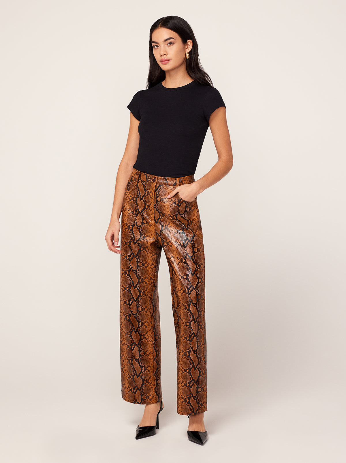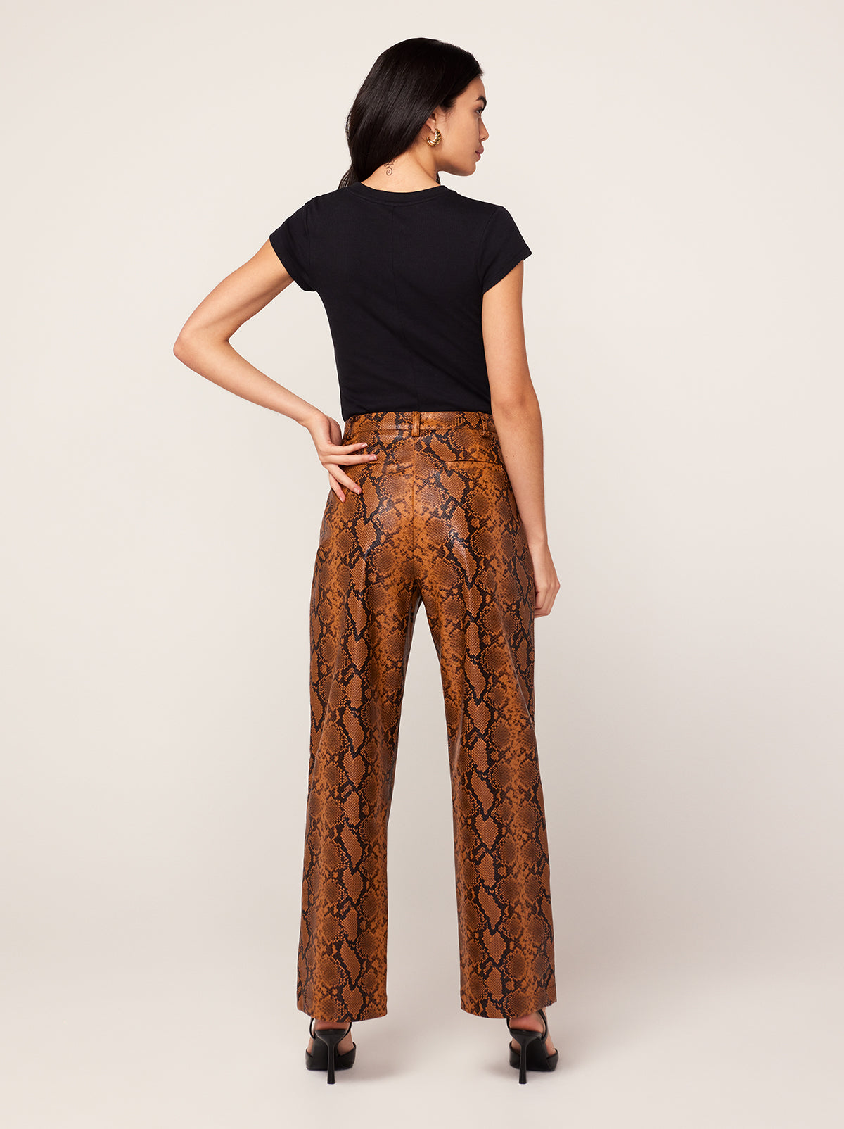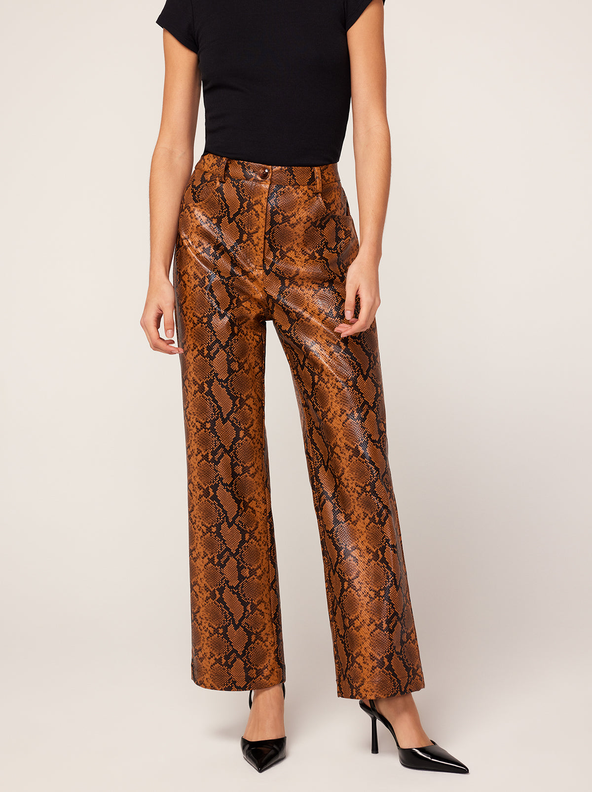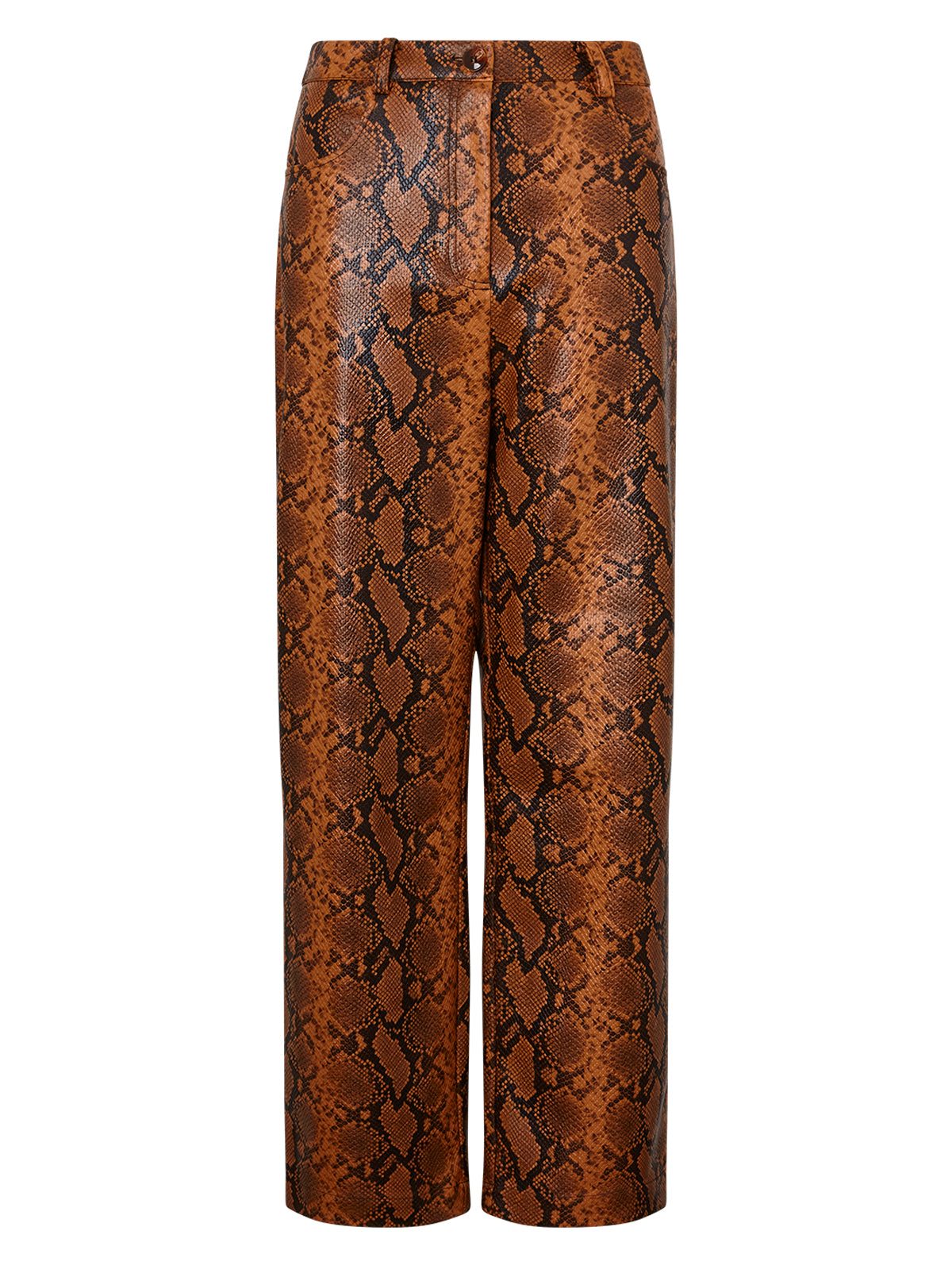 Let your trousers do the talking. Nova is a mid-rise, relaxed pair with a slouchy, wide-leg fit in textured caramel Snakeskin vinyl. Pair with the Wilma Caramel Snakeskin Print Jacket to complete the look.