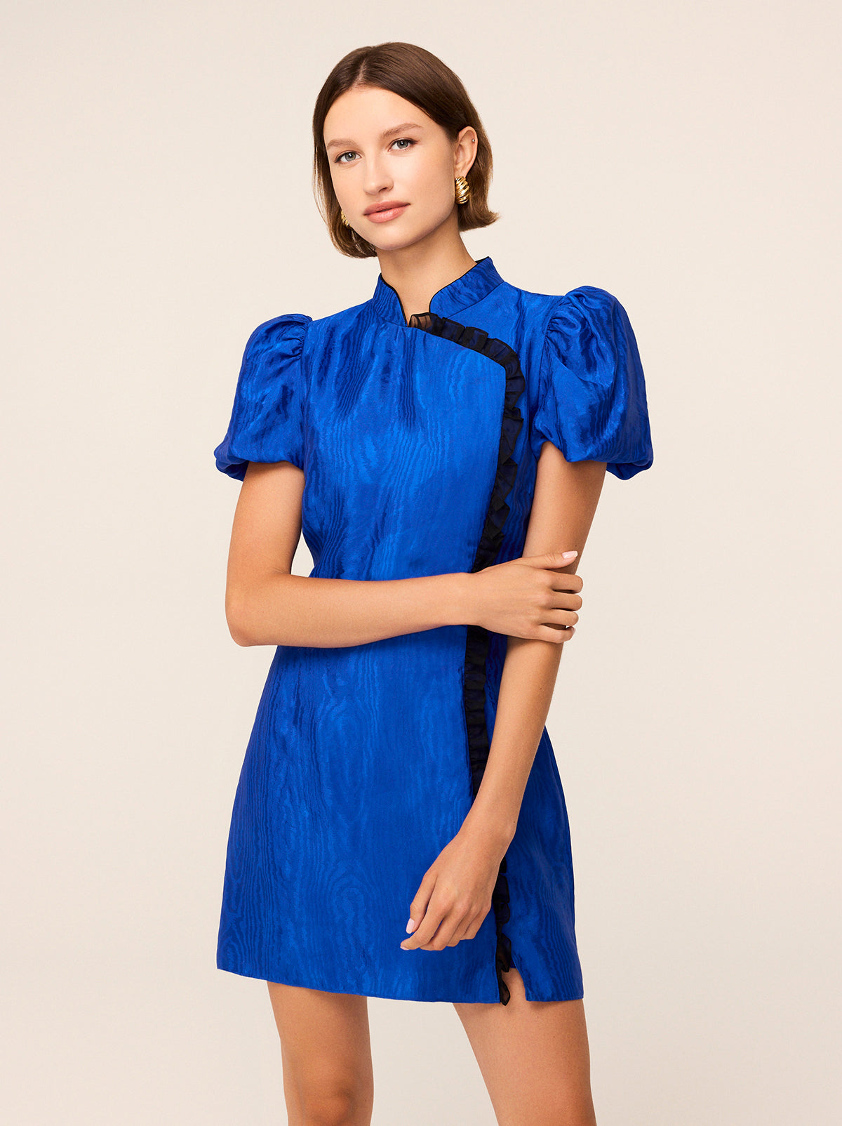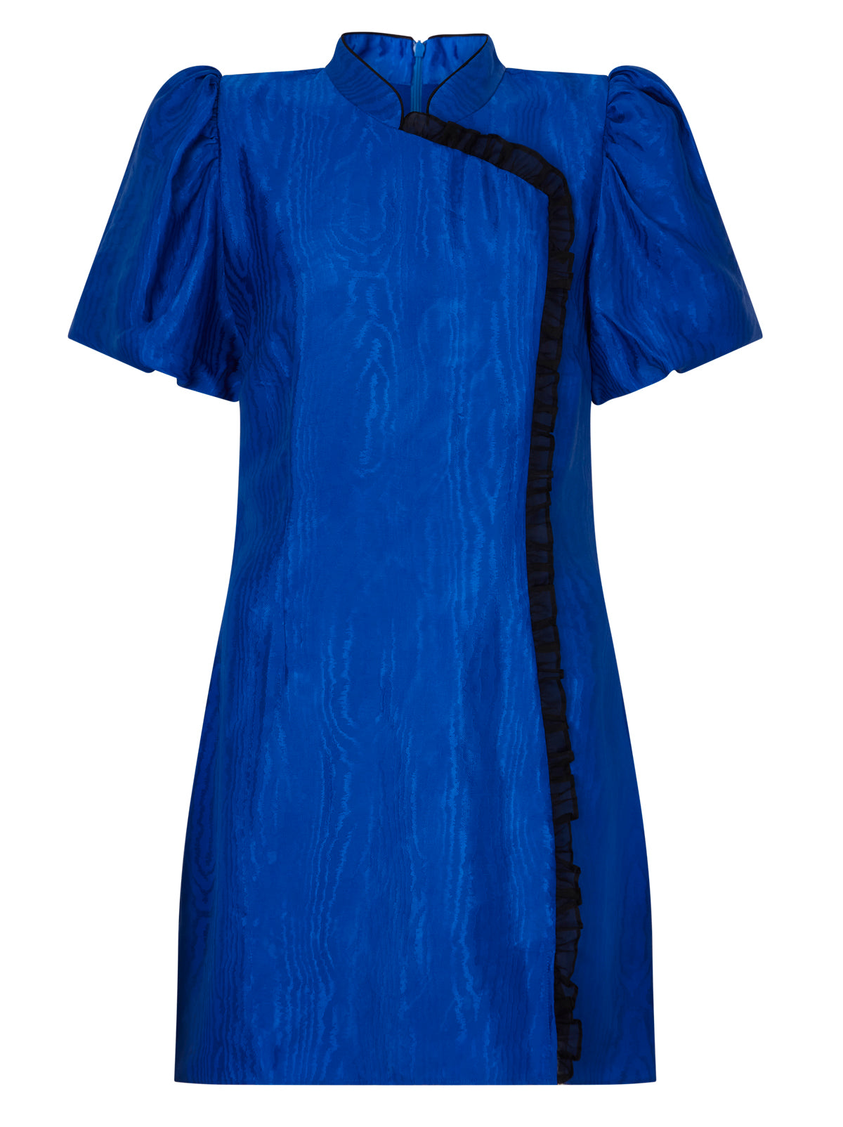 Make an entrance with Philippa in a stunning cobalt blue. This puff-sleeve mini dress is not for the faint of heart, offering a head-turning look with its bold colour and luxurious moiré fabric. The dramatic standing collar and contrast black organza micro-frill detailing elevate her beyond your typical mini dress, making her a statement piece in any wardrobe. Like her black counterpart, Philippa fits through the body for a flattering silhouette, perfect for both formal events and spontaneous nights out. The striking hue ensures you’ll be remembered long after the party ends.
