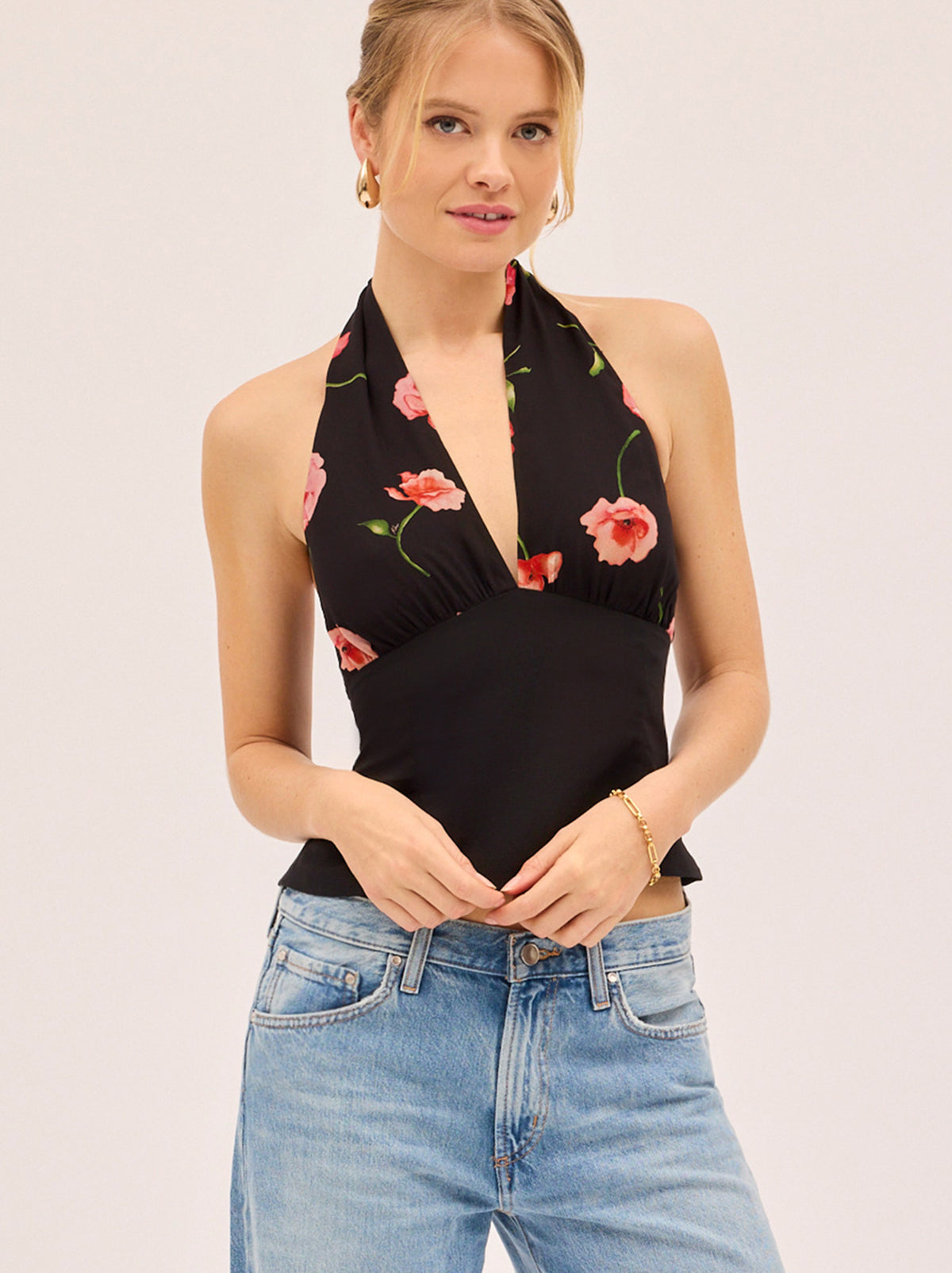 Raine Black Poppy Print Halter Top By KITRI Studio Raine Black Poppy Print Halter Top By KITRI Studio