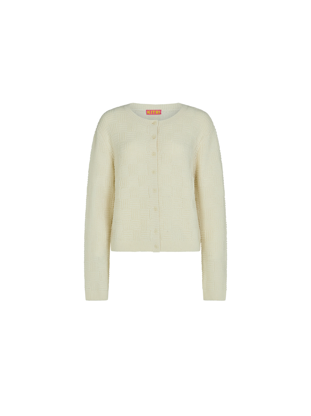 A modern take on a wardrobe classic. The Terri cardigan is crafted from a soft textured knit with a geometric pattern woven throughout adding depth to an everyday layer. Designed with a relaxed round neckline, streamlined button placket and easy, slightly oversized fit.