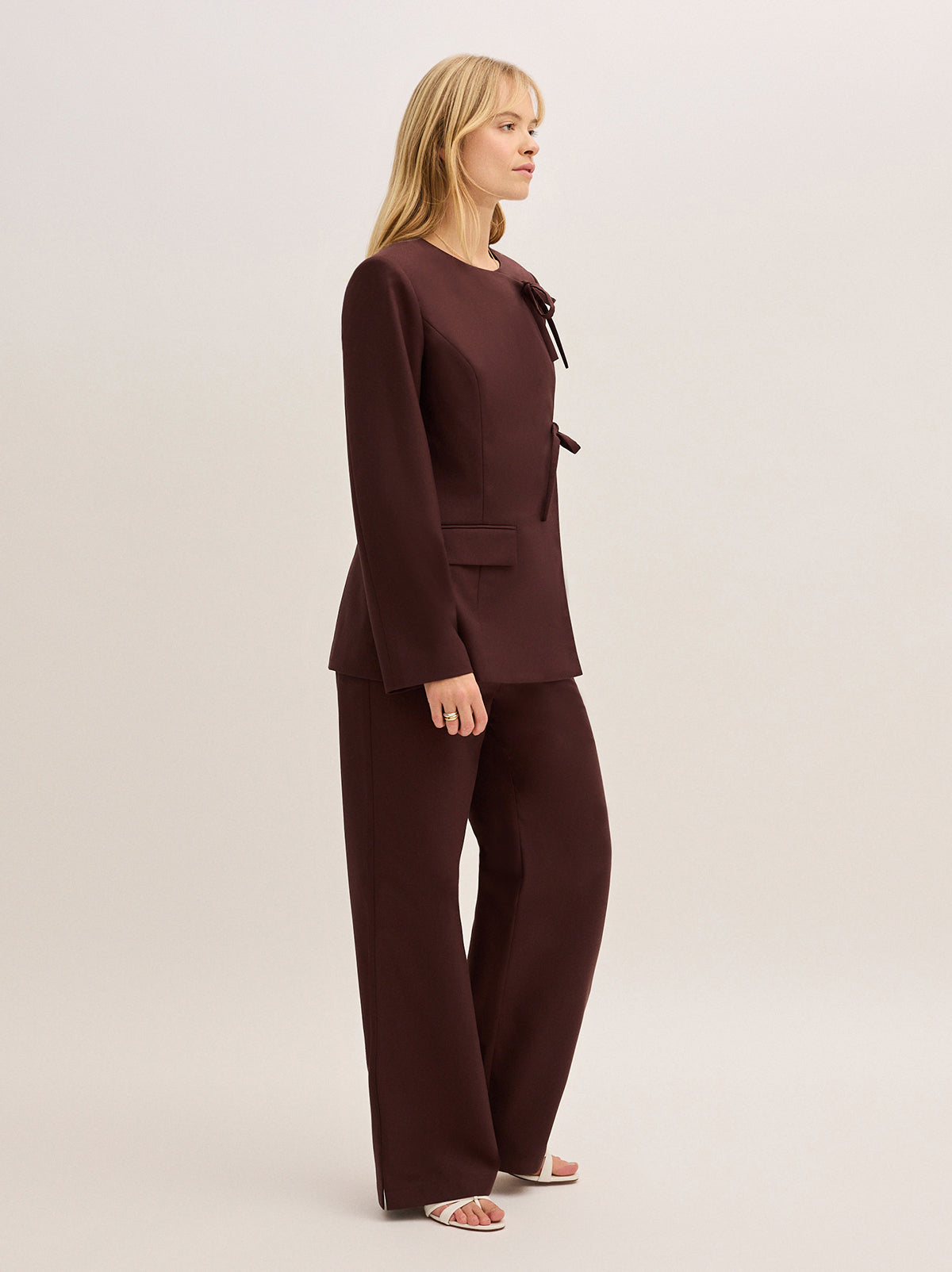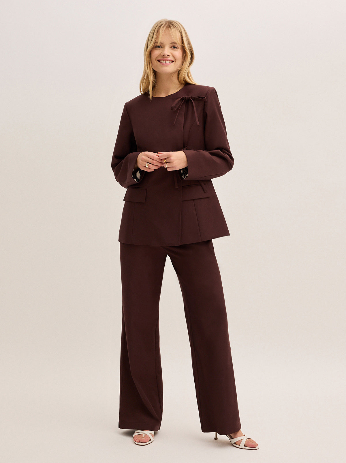 She is so KITRI-coded. The Vivienne Mocha Tailored Blazer blends sharp tailoring with a feminine touch, featuring our signature tie detail to effortlessly cinch the waist. A true powerhouse piece, she is perfect for layering over your go-to looks or styling as a coordinating blazer and trousers set with the Helena Trousers for a polished finish.