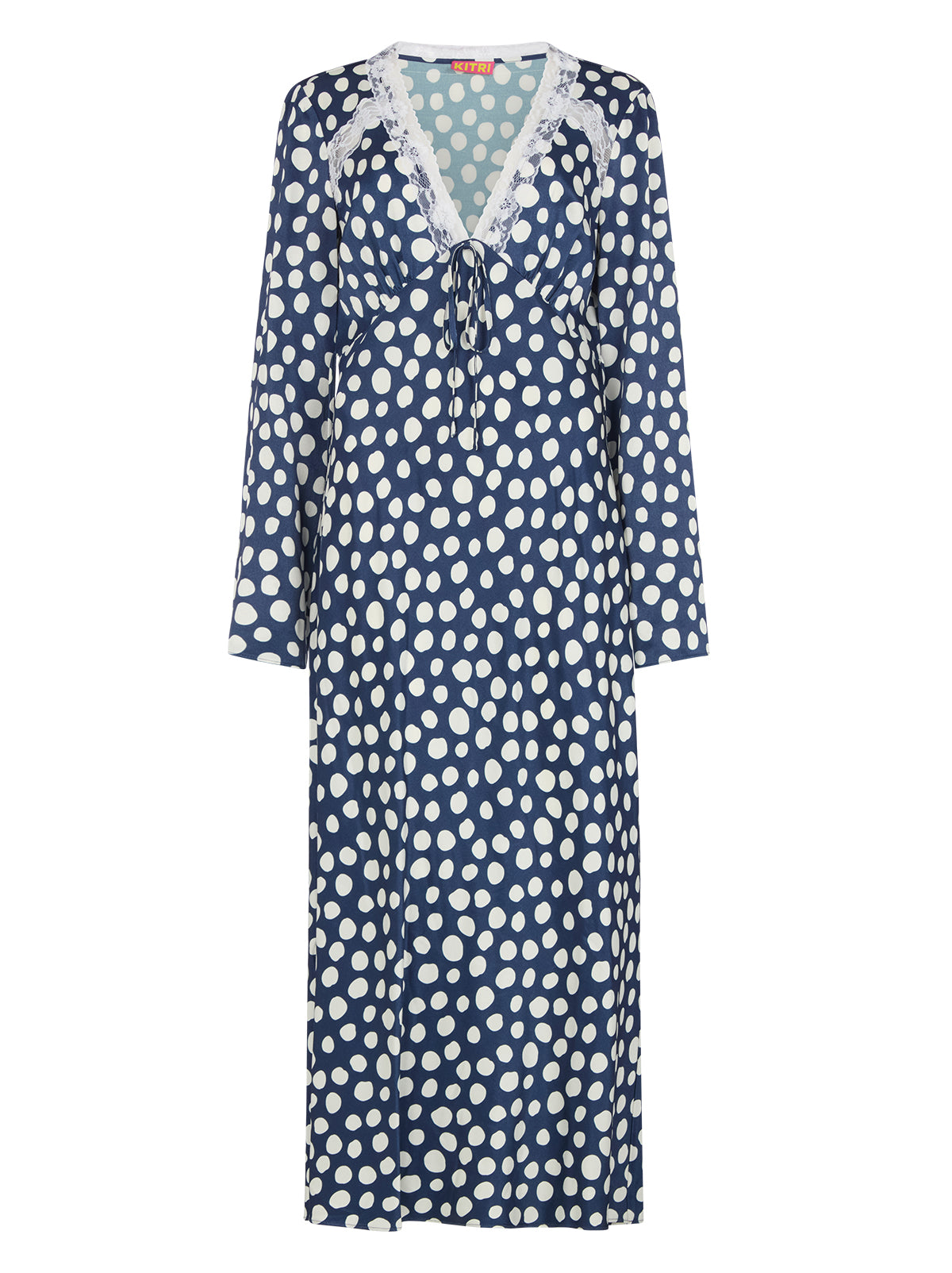 Vintage charm with a modern twist. The Zelda Dress is a bias-cut satin midi, designed to skim the body beautifully for an ultra-flattering fit. The timeless navy polka dot print is elevated with delicate ivory lace details at the neckline, adding just the right amount of romance. With long sleeves for effortless elegance, this is the dress you'll reach for season after season.